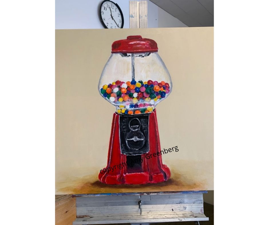 It’s a wrap! I am done with this painting. I just need a title to name it. I find that coming up with a title is either super easy – its has been with me during the making of the painting or it is super hard. That’s when nothing seems to capture my fancy. Now, for a classic, identifiable object, I can just go with the obvious “Gumball Machine” – which I might do. Any other suggestions??