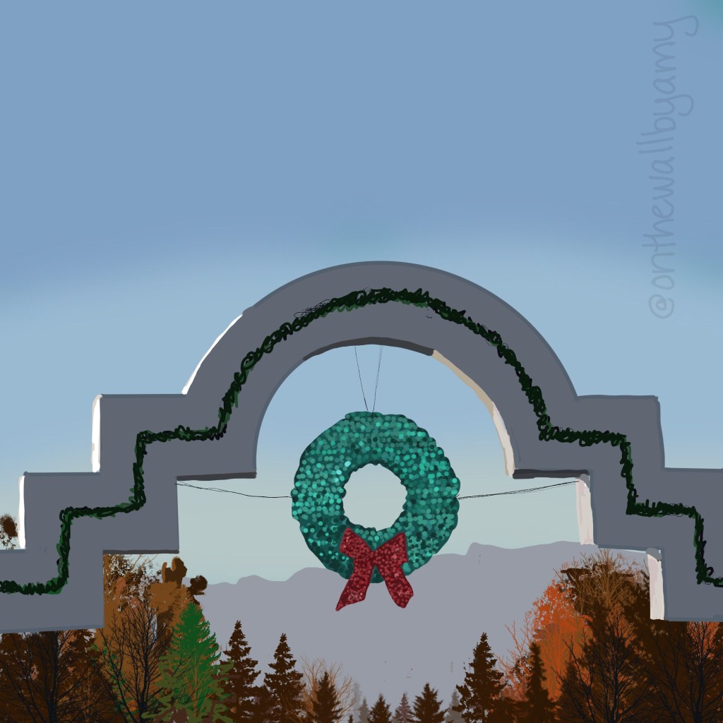 I created this in Procreate – if you live or work in Pleasanton, CA, you might be familiar with these arches. During the holiday season, it get bedazzled with this mirror wreath and garland. I love it! It makes stoplights more interesting. Does your hometown have iconic decorations?